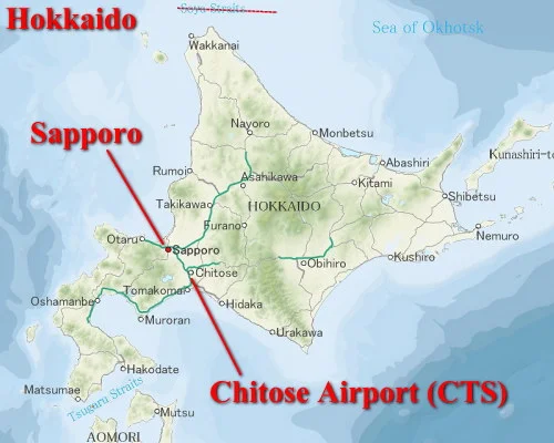 The international airport on the northern island of Hokkaido is the Sapporo New Chitose Airport (CTS). Some international flights fly directly to CTS, but many will have a layover and plane change in Tokyo. The flight from Tokyo to Sapporo is 1.5 hours.